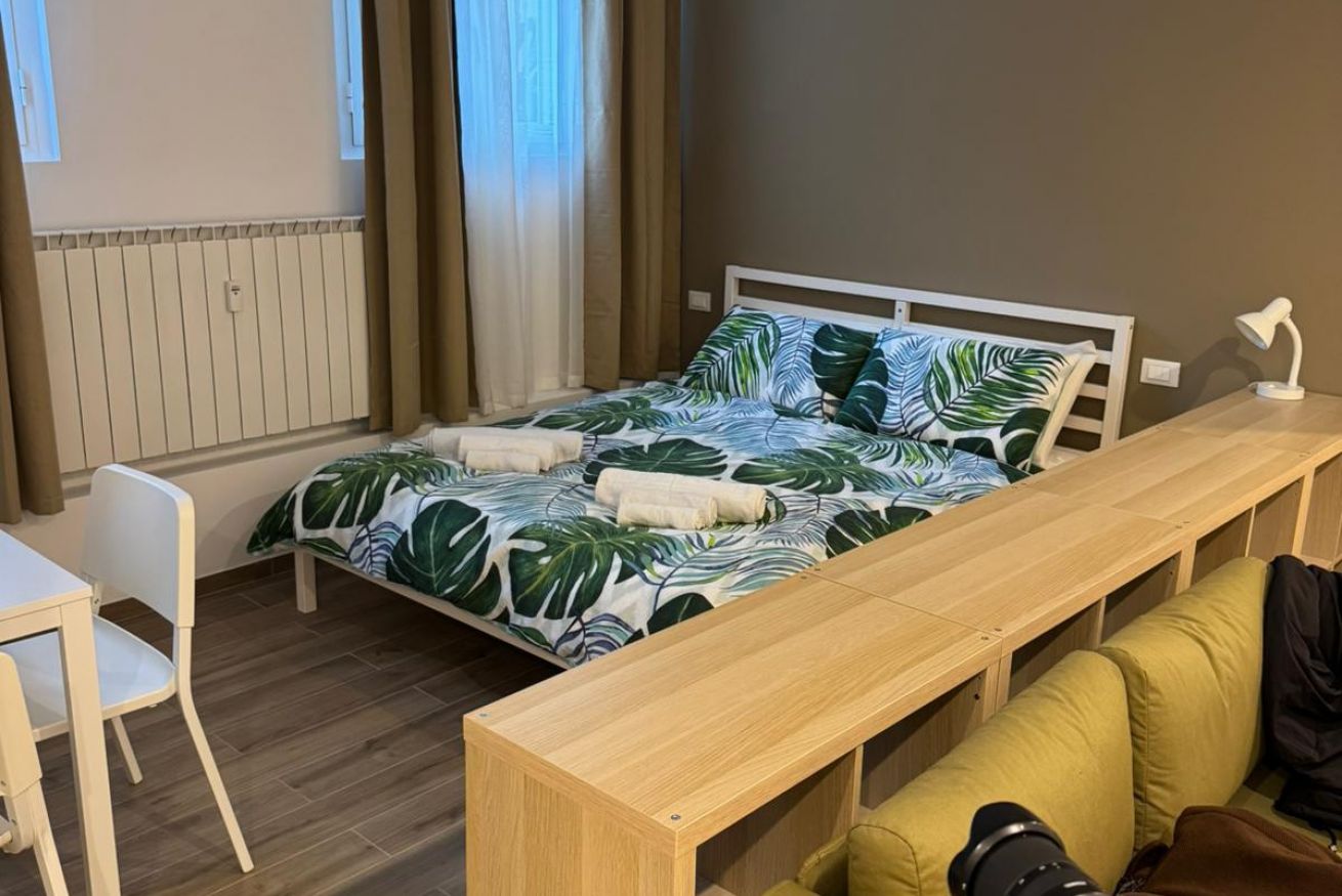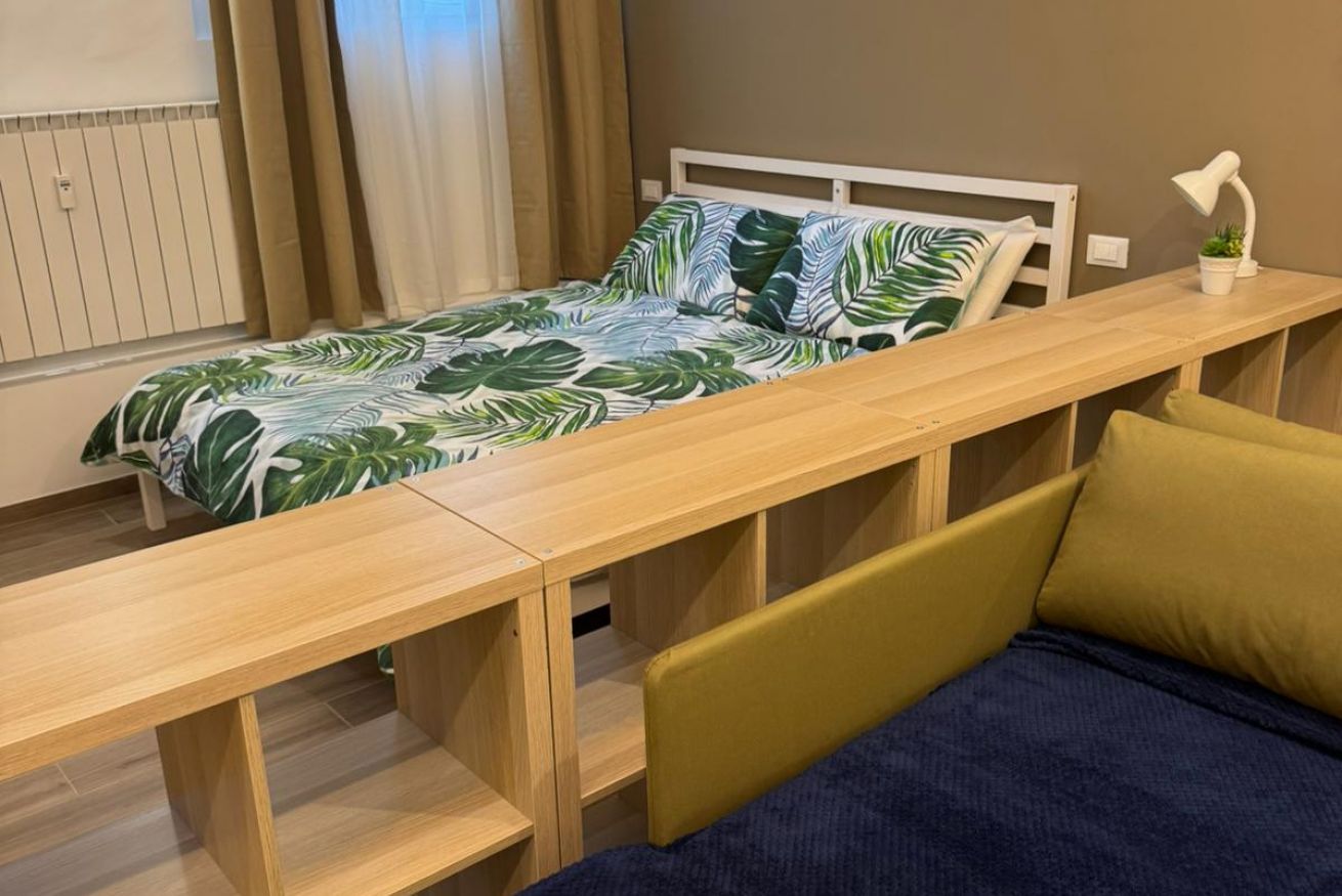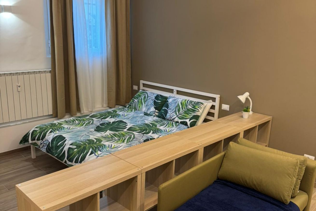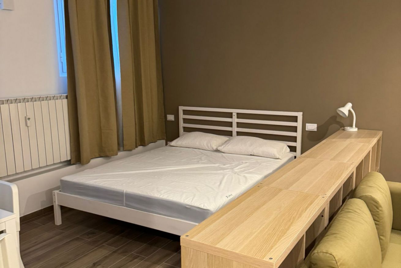 • Zona Notte: Il letto matrimoniale è nascosto dietro un raffinato mobile in legno rovere naturale, che conferisce privacy e un tocco di design sofisticato. L’ambiente è intimo e avvolgente, perfetto per rilassarsi dopo una giornata in città .