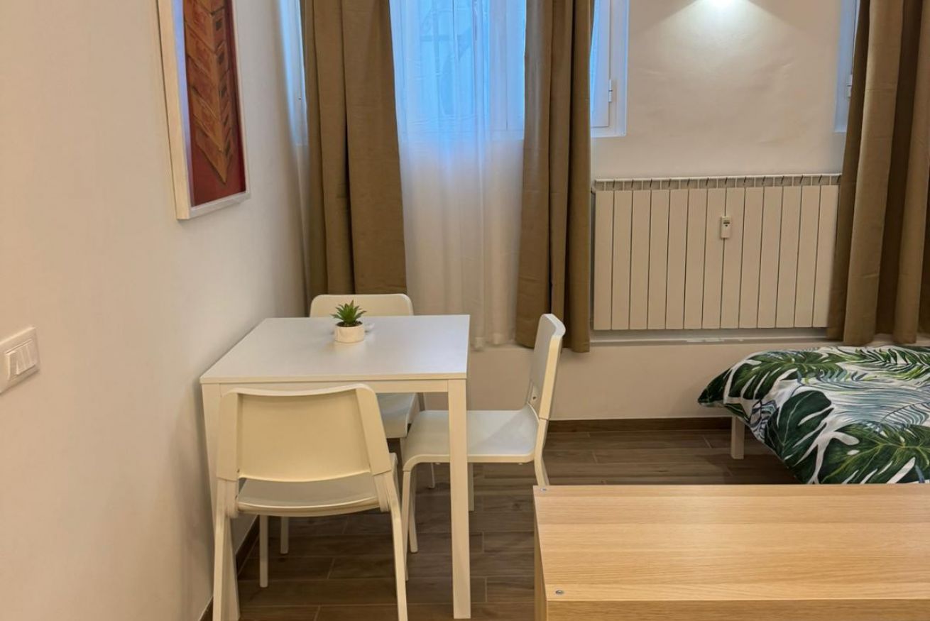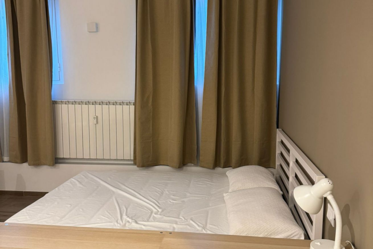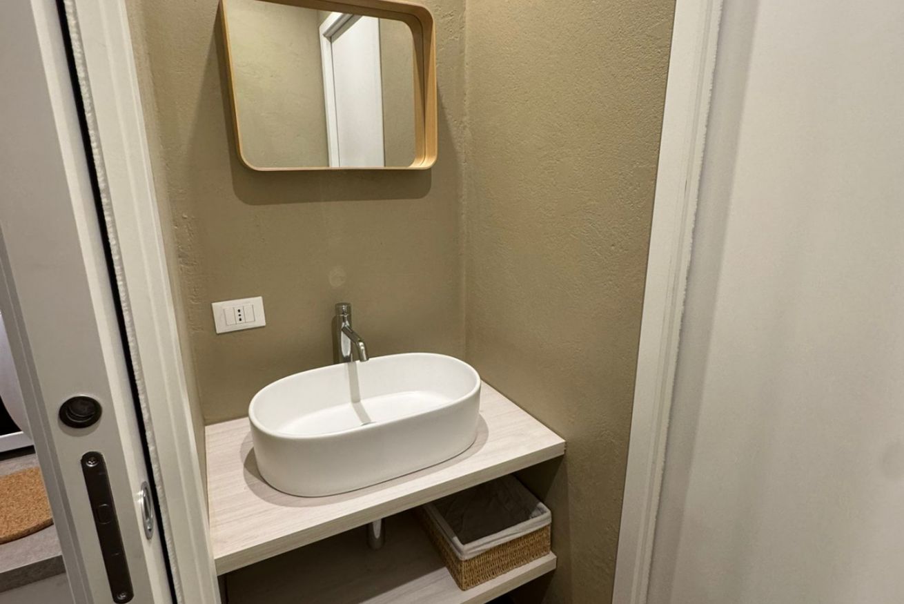 • Zona Notte: Il letto matrimoniale è nascosto dietro un raffinato mobile in legno rovere naturale, che conferisce privacy e un tocco di design sofisticato. L’ambiente è intimo e avvolgente, perfetto per rilassarsi dopo una giornata in città .