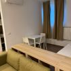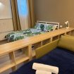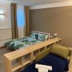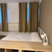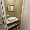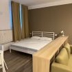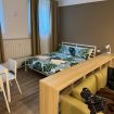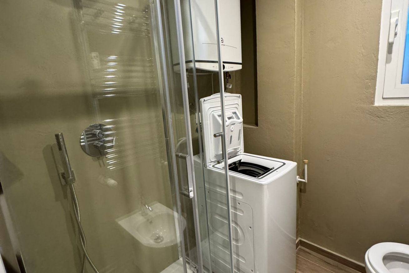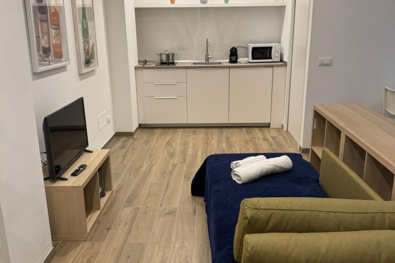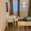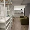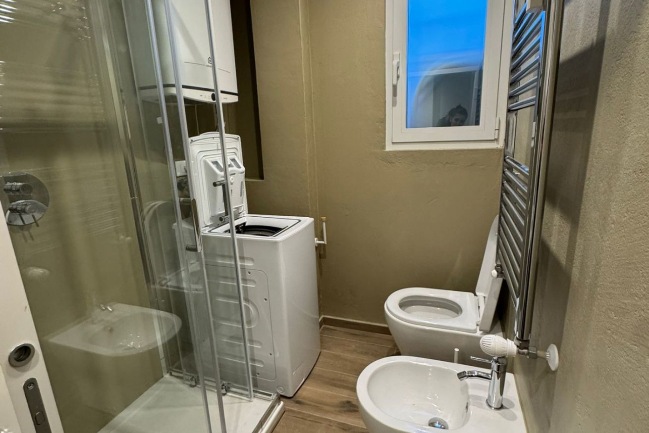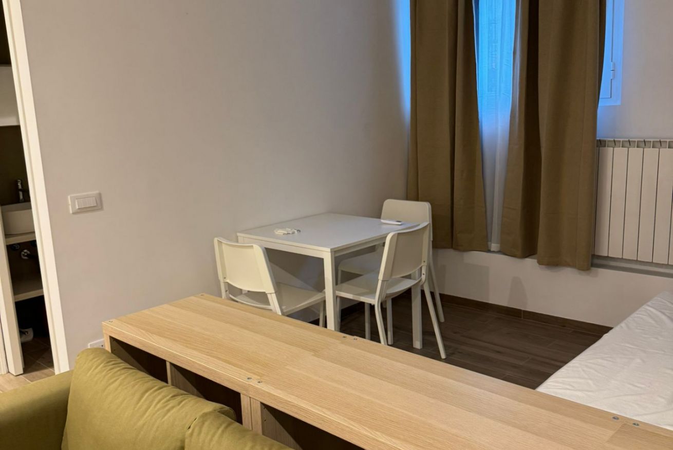 • Zona Notte: Il letto matrimoniale è nascosto dietro un raffinato mobile in legno rovere naturale, che conferisce privacy e un tocco di design sofisticato. L’ambiente è intimo e avvolgente, perfetto per rilassarsi dopo una giornata in città .