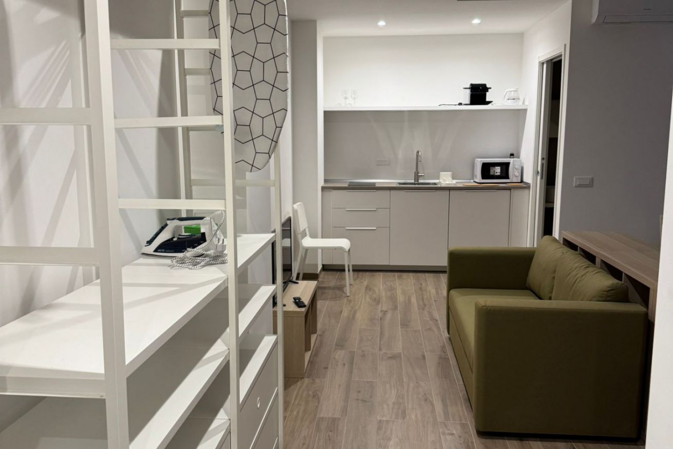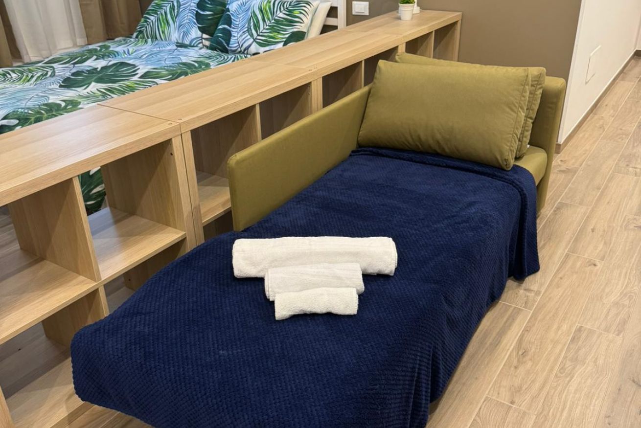 • Zona Living: Un divano elegante di fronte alla Smart TV 4k è perfetto per momenti di relax, serie TV o film. Il divano può trasformarsi in comodo letto ideale per un ospite extra.