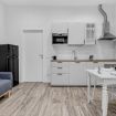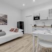 - Soggiorno-cucina abitabile con divano che può trasformarsi in letto matrimoniale e tavolo con sedie.