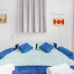 • 🛋️ Il moderno e pregiato Divano Blu, il re della zona living si trasforma su richiesta in un letto matrimoniale con materasso alto ed ergonomico, comodo come un vero e proprio letto.