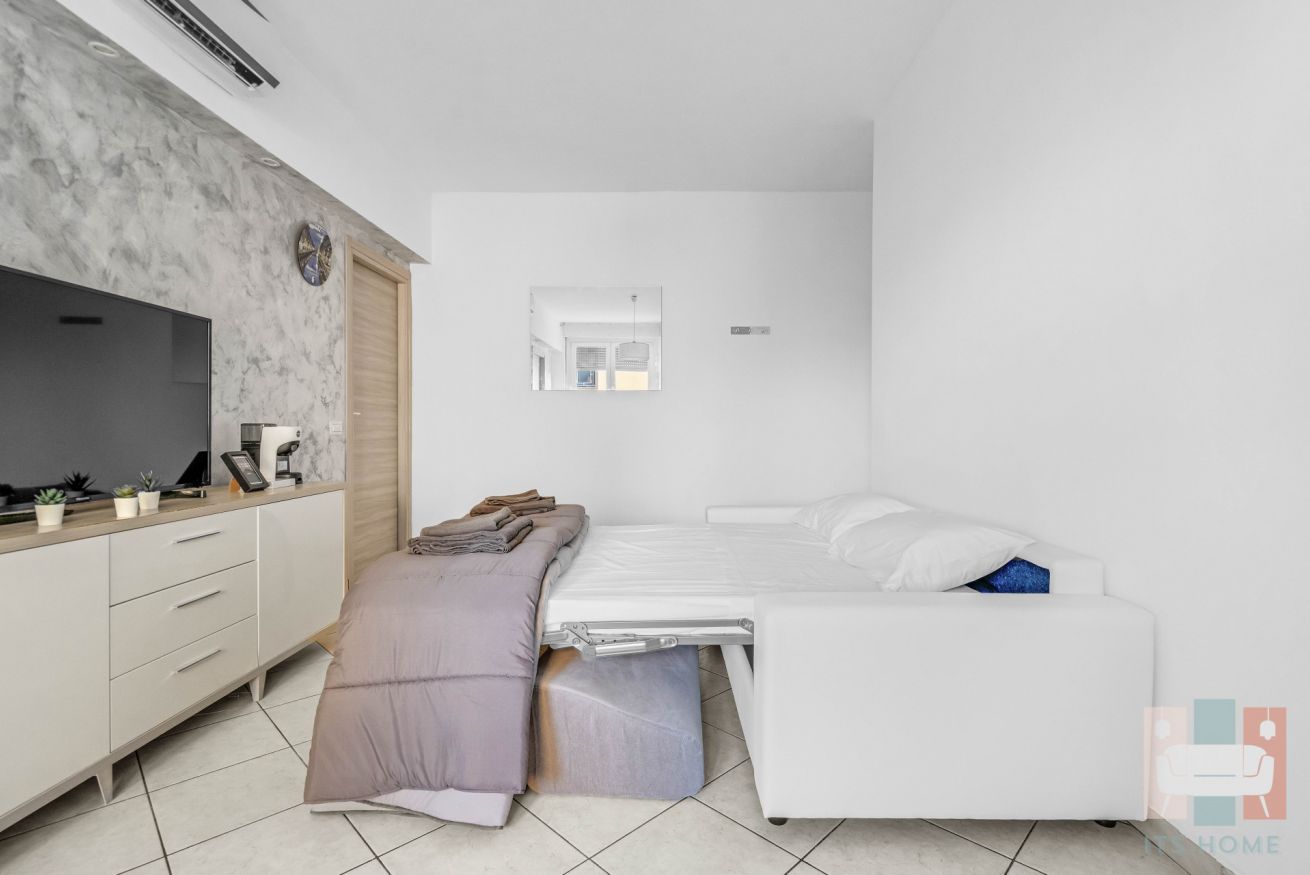 Il soggiorno, cuore conviviale della casa, si trasforma all’occorrenza grazie al divano letto apribile, che diventa un comodo letto matrimoniale. Di giorno è lo spazio perfetto per rilassarsi, chiacchierare o guardare un film; di notte si trasforma in un’accogliente area riposo.