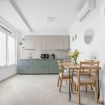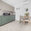 🍽️ Cucina a vista attrezzata con piano cottura a induzione, frigo, microonde, lavastoviglie, macchina del caffè, bollitore, pentole, stoviglie e tavolo con sedie.